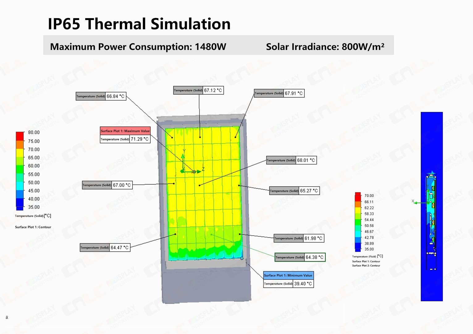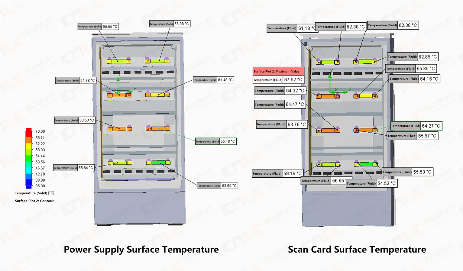To verify the thermal stability of CNLC outdoor displays under high power and temperature conditions, a detailed thermal simulation was conducted.