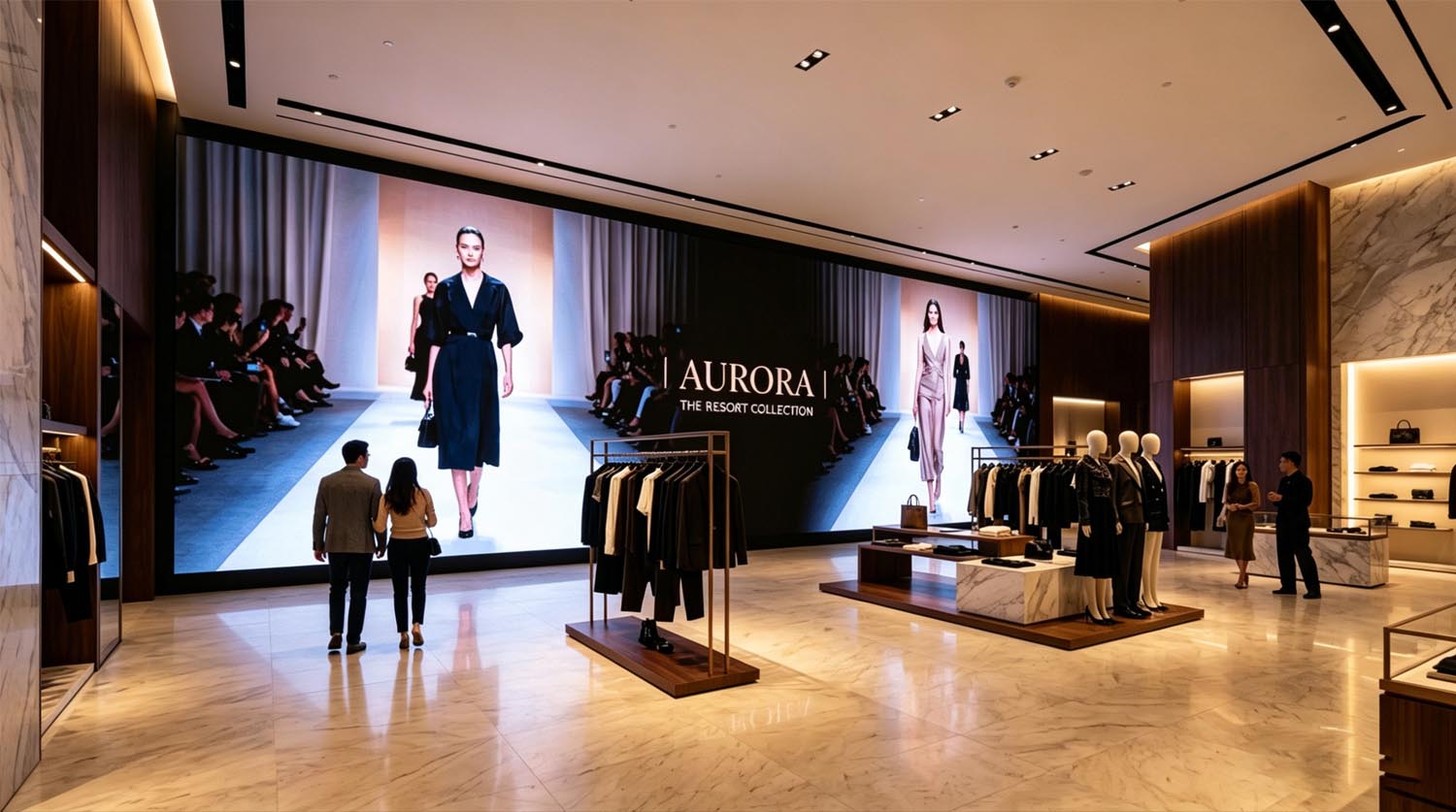 A luxury fashion brand implemented a 12-meter COB LED wall in its flagship retail store to replace multiple LCD panels.